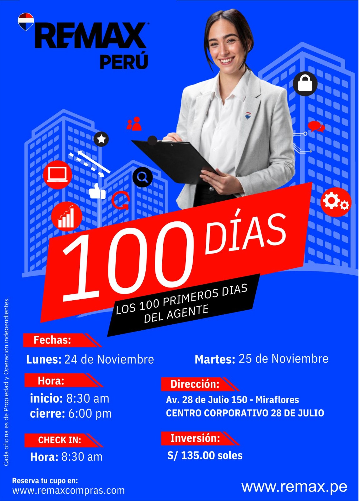Les recordamos que está disponible el curso *Los 100 primeros días del Agente RE/MAX*, una excelente oportunidad para aprender sobre el inicio de tu negocio, captación, negociación, marketing inmobiliario, atención al cliente vendedor y comprador, ¡y muchos temas más!