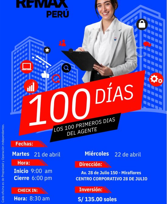 Queremos informarles que ya tenemos disponible la próxima fecha del curso “Los 100 primeros días del Agente REMAX”, donde tendrás la oportunidad de aprender sobre el inicio de tu negocio inmobiliario, captación, negociación, marketing inmobiliario, manejo del cliente vendedor y comprador, entre muchos otros temas clave.